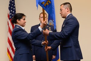Capt. Elvis Ta accepts command of the 403rd Communications Flight from Col. Beena Maharaj, 403rd Mission Support Group commander, at an assumption of command ceremony January 10, 2015. The ceremony was held at the Roberts Consolidated Aircraft Maintenance Facility, Keesler Air Force Base, Miss.
