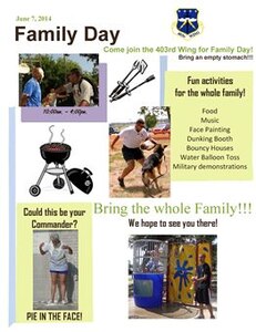 April 17, 2014 403rd Wing Family Day in June Many reservists who worked during a unit training assembly with especially beautiful weather wished they could have been enjoying the weekend with their families, having some fun in the sun. If the weather cooperates, the June Unit Training Assembly will provide reservists that opportunity during