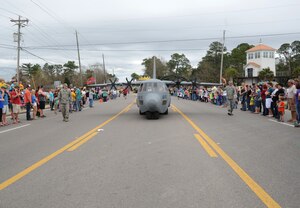 The 403rd Wing's "Lil' Bill," a C-130J aircraft prototype, from Keesler rolls through the crowded streets during the 26th Annual North Bay Area Mardi Gras Parade in D'Iberville, Miss., March 2, 2014. Leadership from the 81st Training Wing, the Keesler Honor Guard, Airmen carrying the 50 state flags