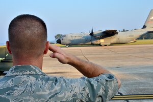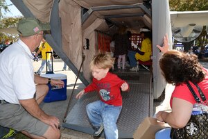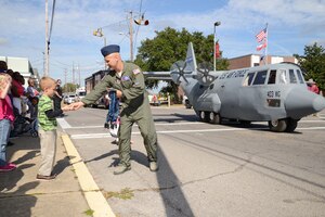 A young "paratrooper" jumps out the back of Lil' Bill, which was parked at the Biloxi Town Green after the Biloxi Veterans Day parade held Nov. 9. Members of the 403rd Wing, Keesler Air Force Base, Miss., guided the mock C-130J aircraft through the streets of Biloxi, Miss., during the event.