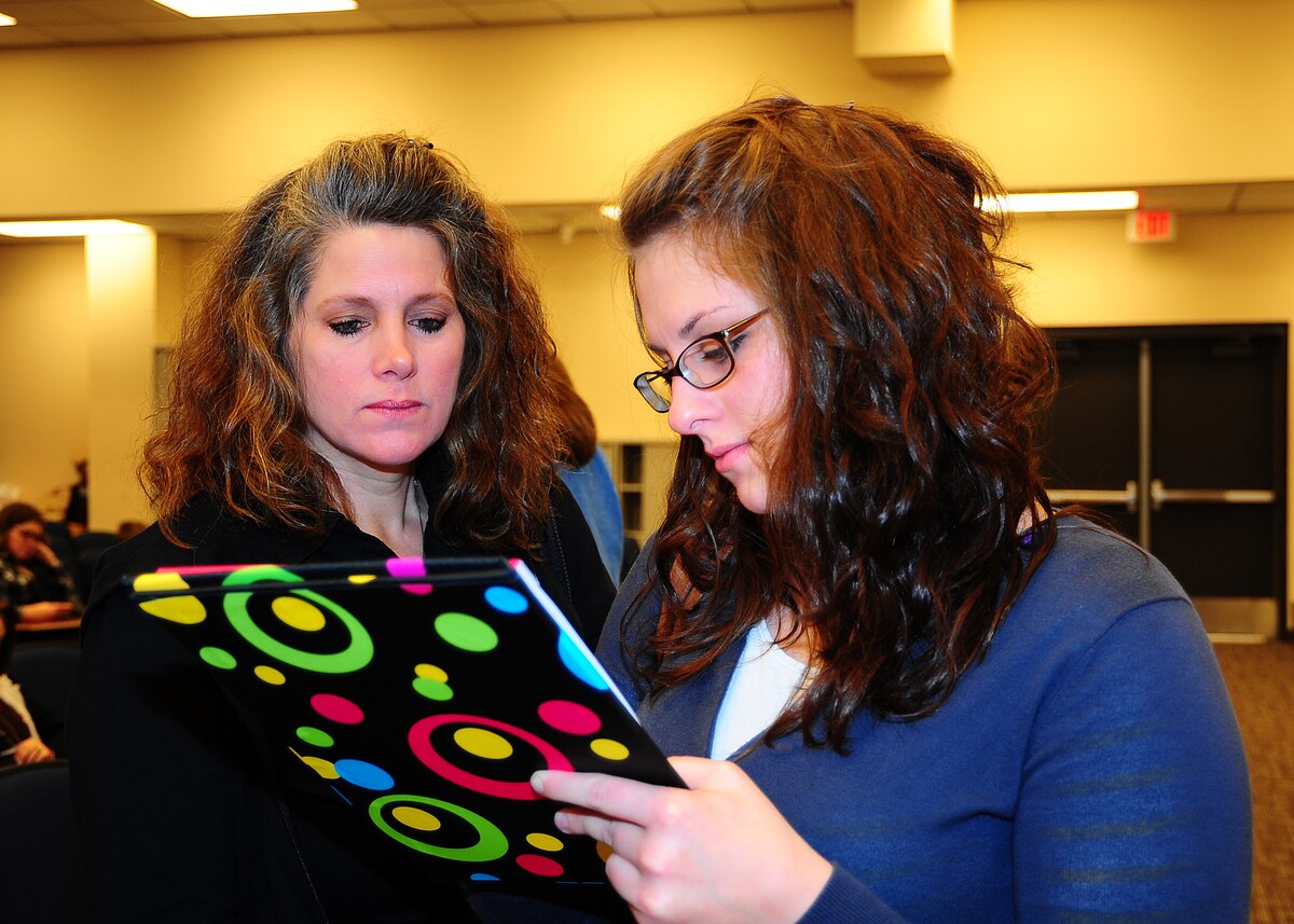 Aubrey Black, sister of Senior Airman Addison Black from the 403rd Maintenance Squadron, fills out a family contact information form in the 815th and 345th Airlift Squadron Jan. 8, while their mother, Lisa, looks on. Reservists with the 403rd Maintenance Group and 815th AS and active-duty members from the 345th AS deployed for 120 days in support of overseas contingency operations in Southwest Asia. The 815th "Flying Jennies" and 345th "Golden Eagles," an active associate unit, work and train side by side as part of the 403rd Wing at Keesler Air Force Base, Miss. (U.S. Air Force photo by Staff Sgt. Yolanda Addison)