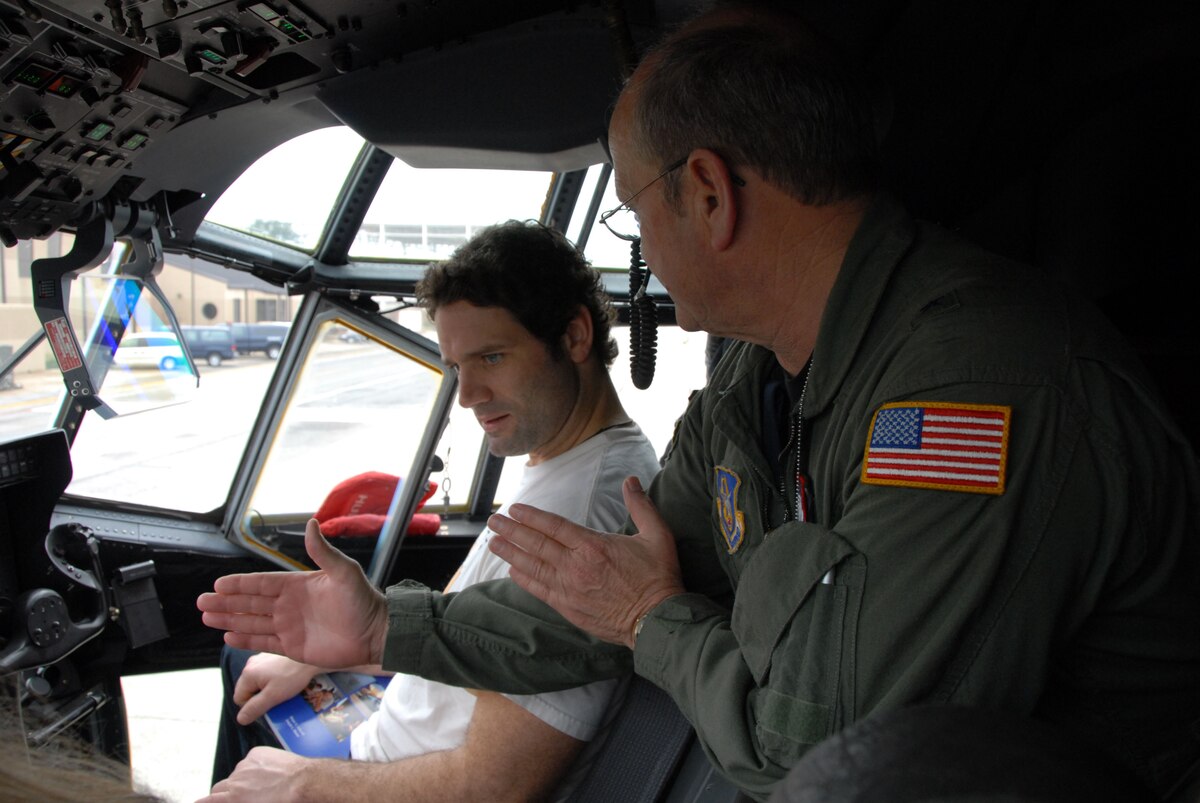 Joe Dziedzic, a National Hockey League alumni, listens as Brig. Gen. Rich Moss, commander, 403rd Wing, explains how pilots manuever the WC-130J aircraft in a storm environment during hurricane missions. Dziedzic and a group of NHL alumni spent time learning about the hurricane mission of the 53rd Weather Reconnaissance Squadron on Friday. The former hockey stars came from different places to support a charity event for the Mississippi SeaWolves Foundation.