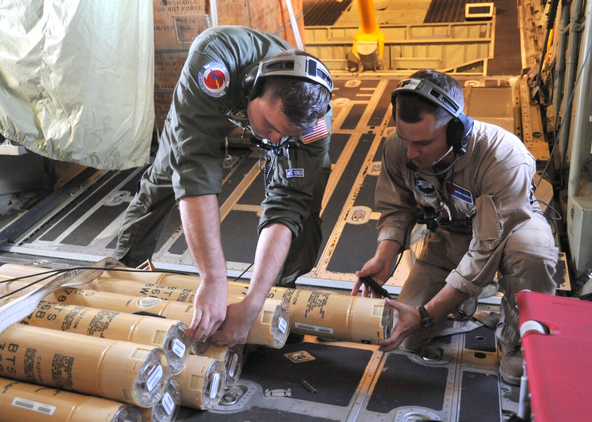 Senior Airman Nathan Calloway, 53rd Weather Reconnaissance Squadron dropsonde operator, and Marine 2nd Lt. Anthony Borrego, who just graduated from the Naval Academy and serving with the Naval Academy's Training and Research in Oceanic and Atmospheric Processes in Tropical Cyclones, or TROPIC, internship program, prepare Airborne/Air Expendable Bathythermograph, or AXBT, deep water buoys for a flight into Tropical Storm Guillermo off the coast of Hawaii Aug. 3, 2015. Borrego flew with the Air Force Reserve’s 53rd Weather Reconnaissance Squadron into Tropical Storm Guillermo in order to collect salinity and water temperature for research. The 53rd WRS "Hurricane Hunters" aircrew and 403rd Wing maintenance personnel deployed to Joint Base Pearl Harbor-Hickam, Hawaii to fly storm missions into Guillermo. (U.S. Air Force photo/Maj. Marnee A.C. Losurdo)