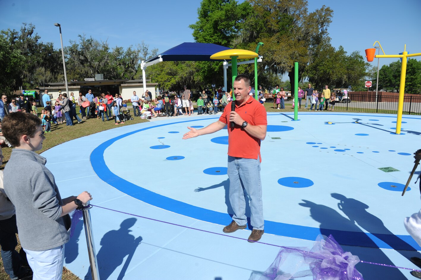 Brig. Gen. Patrick Higby, 81st Training wing commander, welcomes the crowd to the Keesler Outdoor Recreation’s Splash Pad grand opening at the marina April 19, 2014, at Keesler Air Force Base, Miss. The splash pad was funded with a portion of the 2013 Commander-in-Chief Installation Excellence award funds. (U.S. Air Force photo by Kemberly Groue)
