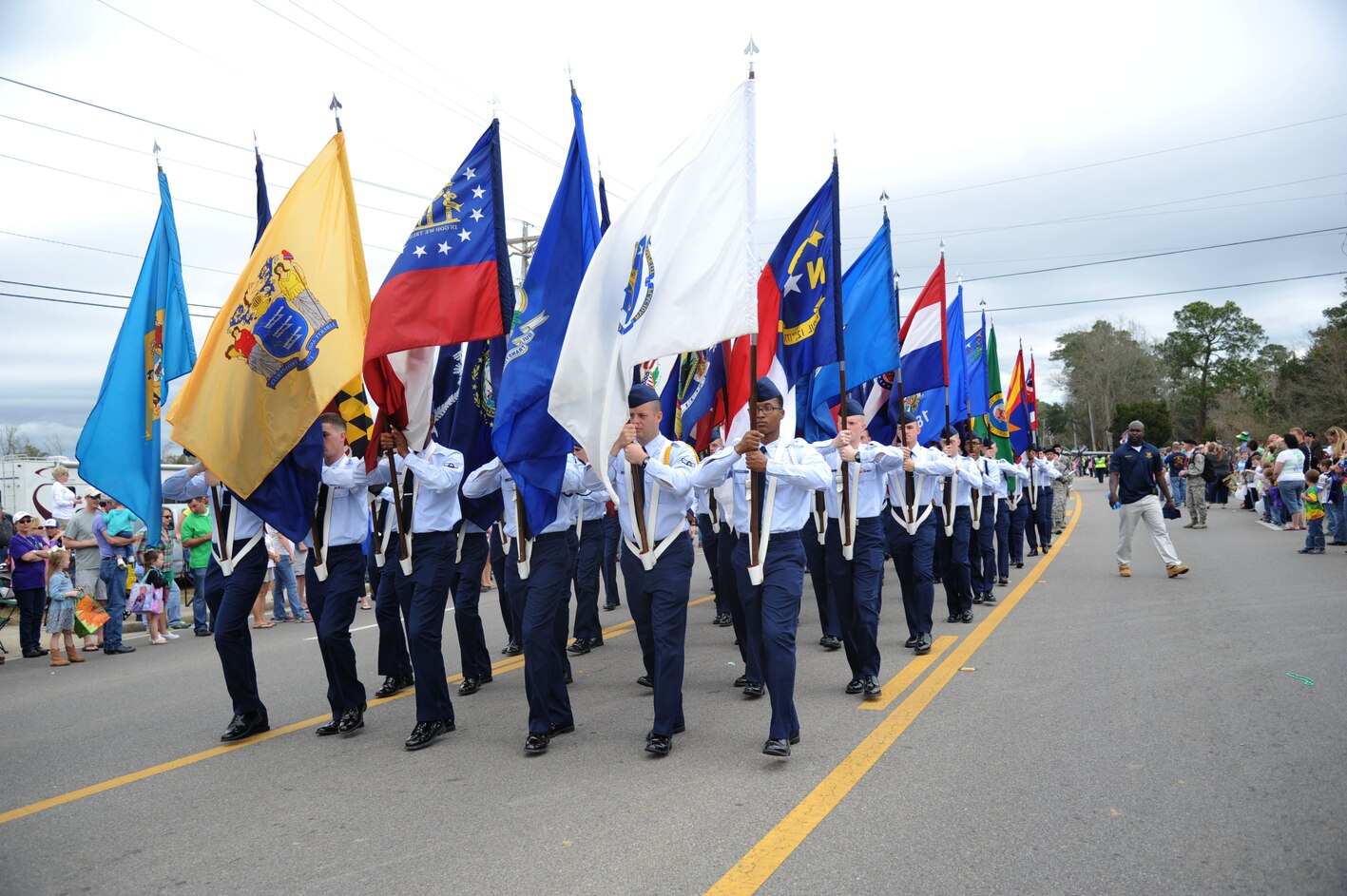 Airmen carrying the 50 state flags follow behind the Keesler Honor Guard leading the 26th Annual North Bay Area Mardi Gras Parade in D’Iberville, Miss., March 2, 2014. Leadership from the 81st Training Wing and the 81st Training Group drum and bugle corps also participated in the festivities. (U.S. Air Force photo by Kemberly Groue)