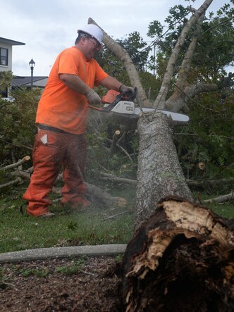 Vectrus contractors work to clear fallen trees and debris on Keesler Air Force Base, Mississippi, Oct. 8, 2017, after Hurricane Nate, a category one hurricane, made landfall just West of the base. There were no injuries to Keesler AFB personnel and the base sustained no major damage or significant flooding. This is the first hurricane to hit the base since Katrina in 2005, which caused devastation along the Gulf Coast. (U.S. Air Force photo by Senior Airman Travis Beihl)