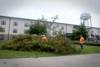 Vectrus contractors work to clear fallen trees and debris on Keesler Air Force Base, Mississippi, Oct. 8, 2017, after Hurricane Nate, a category one hurricane, made landfall just West of the base. There were no injuries to Keesler AFB personnel and the base sustained no major damage or significant flooding. This is the first hurricane to hit the base since Katrina in 2005, which caused devastation along the Gulf Coast. (U.S. Air Force photo by Senior Airman Travis Beihl)