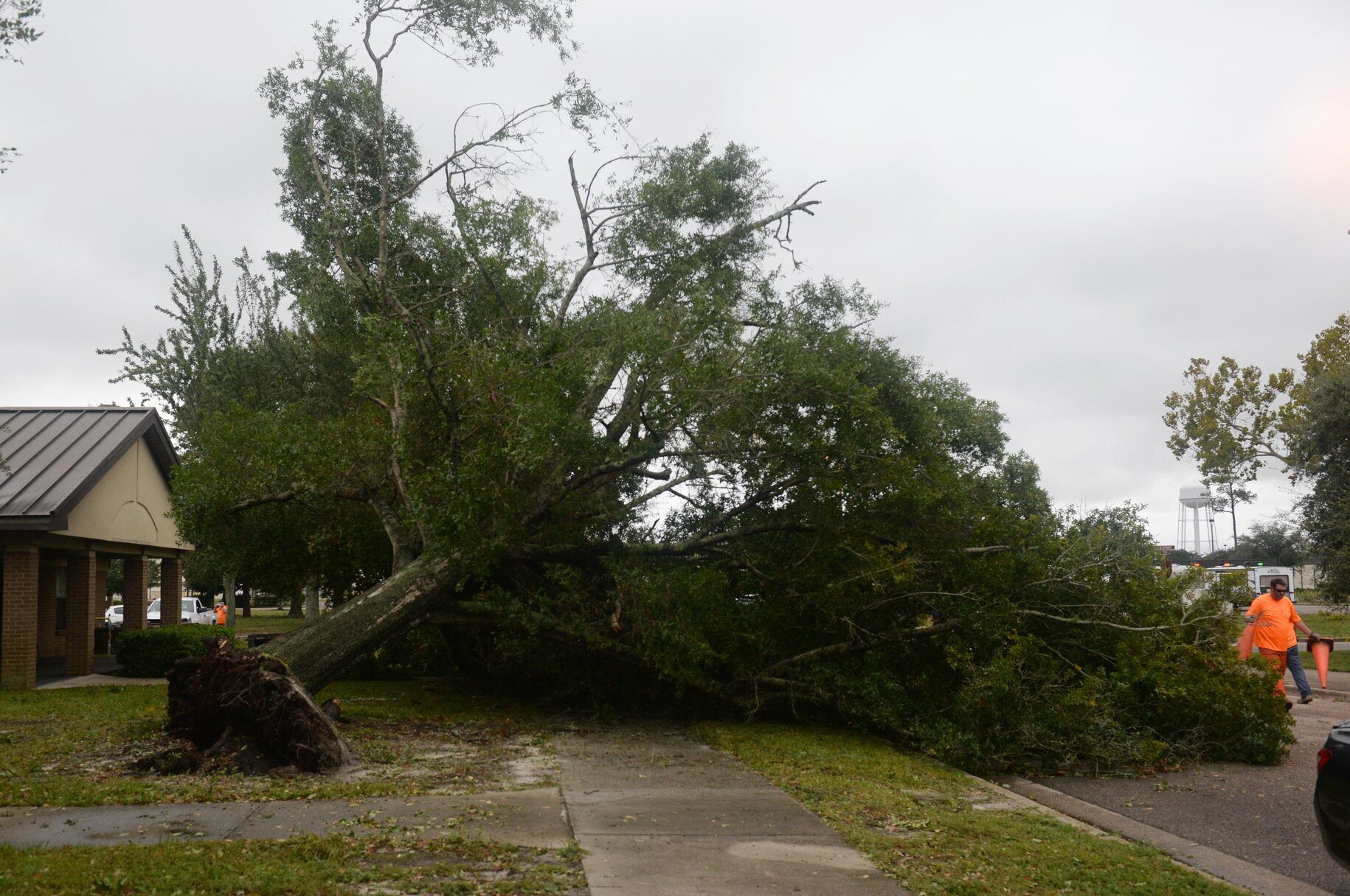 Vectrus contractors work to clear fallen trees and debris on Keesler Air Force Base, Mississippi, Oct. 8, 2017, after Hurricane Nate, a category one hurricane, made landfall just West of the base. There were no injuries to Keesler AFB personnel and the base sustained no major damage or significant flooding. This is the first hurricane to hit the base since Katrina in 2005, which caused devastation along the Gulf Coast. (U.S. Air Force photo by Senior Airman Travis Beihl)