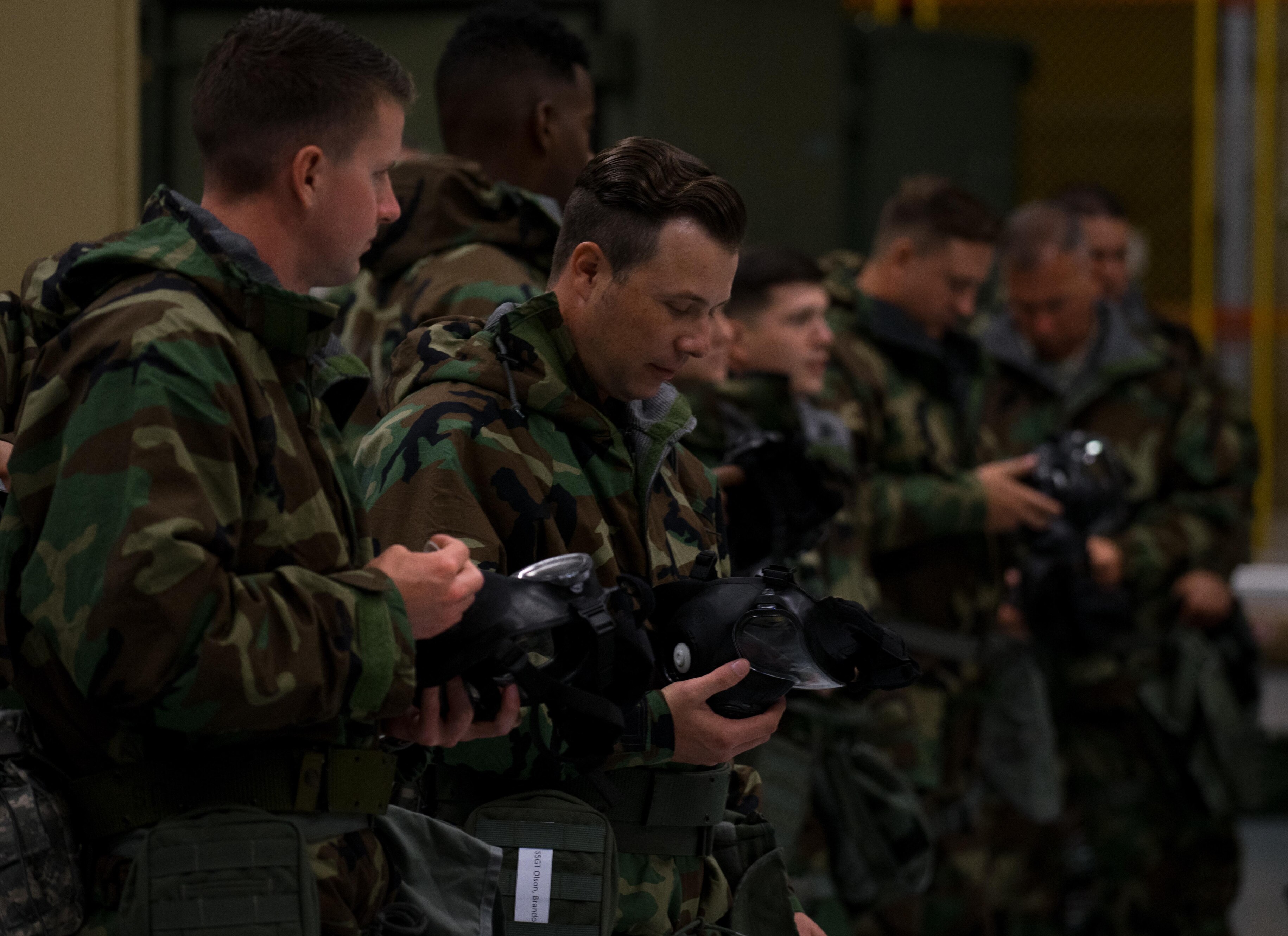 Airmen from the 403rd Wing at Keesler Air Force Base, Mississippi inspect their gas masks during a training on October 15, 2017. The mask, along with other Mission Oriented Protective Posture (MOPP) Gear is used to protect members during Chemical, Biological, Radiological and Nuclear attacks. (U.S. Air Force photo/Staff Sgt. Shelton Sherrill)