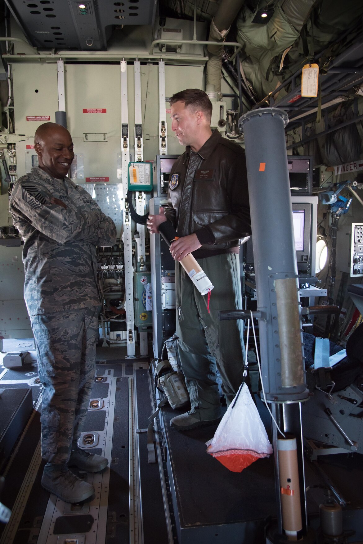 Chief Master Sergeant of the Air Force Kaleth O. Wright learns about the 53rd Weather Reconnaissance Squadron Hurricane Hunters from Staff Sgt. Nathan Calloway, 53rd WRS loadmaster, during his visit to the 403rd Wing Oct. 25, 2017 at Keelser Air Force Base, Mississippi. (U.S. Air Force photo/Staff Sgt. Heather Heiney)