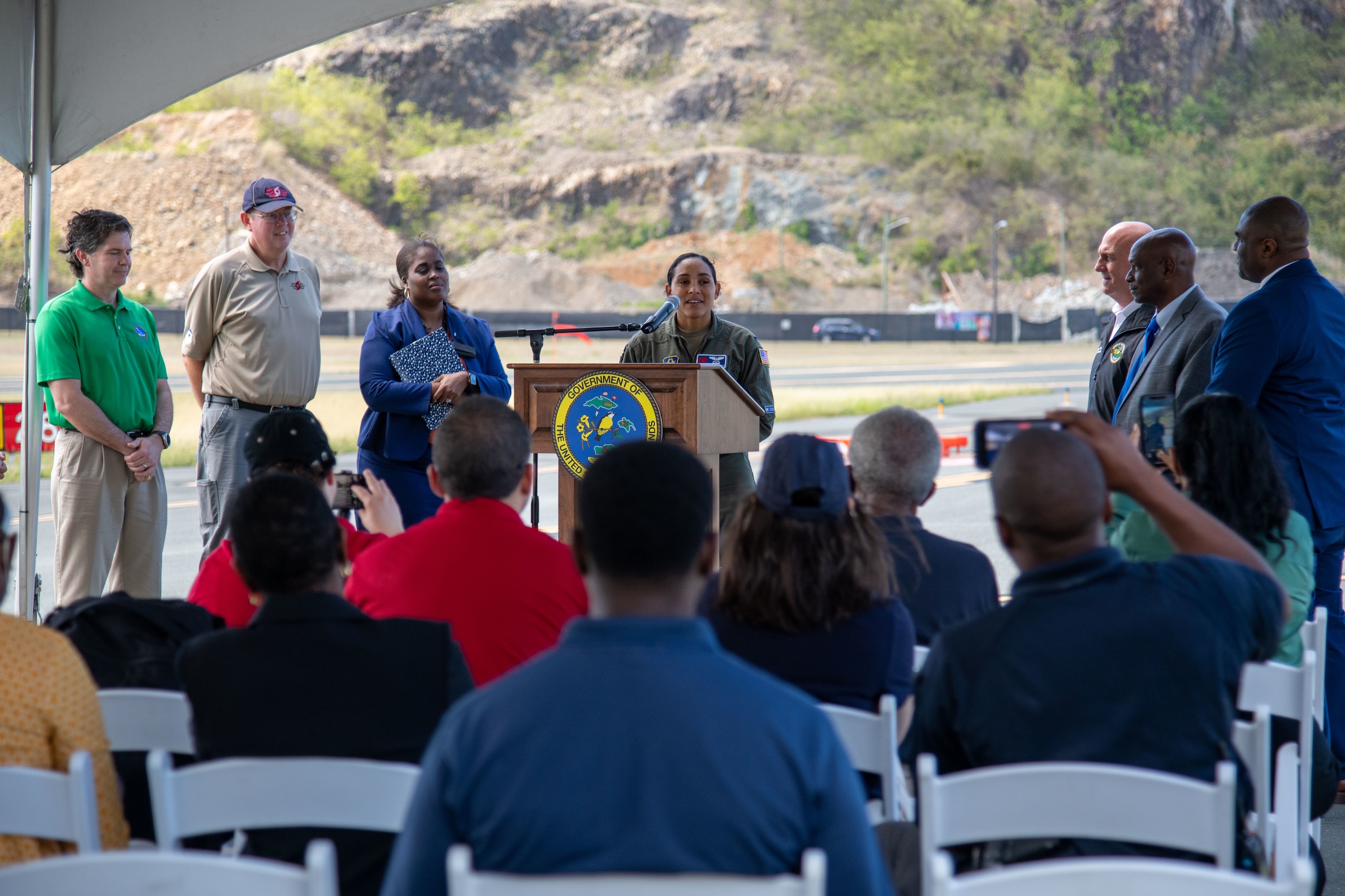 1st Lt. Amaryllis Cotto, aerial reconnaissance weather officer for the 53rd Weather Reconnaissance Squadron at Keesler Air Force Base, Miss., speaks to a crowd at Cyril E. King Airport, St. Thomas, U.S.V.I., April 20, 2022. Members of St. Thomas’s port authority, Civil Air Patrol, U.S.V.I. Police Department, and other first responders were in attendance for the 2022 National Hurricane Center’s Caribbean Hurricane Awareness Tour. (U.S. Air Force photo by Staff Sgt. Kristen Pittman)