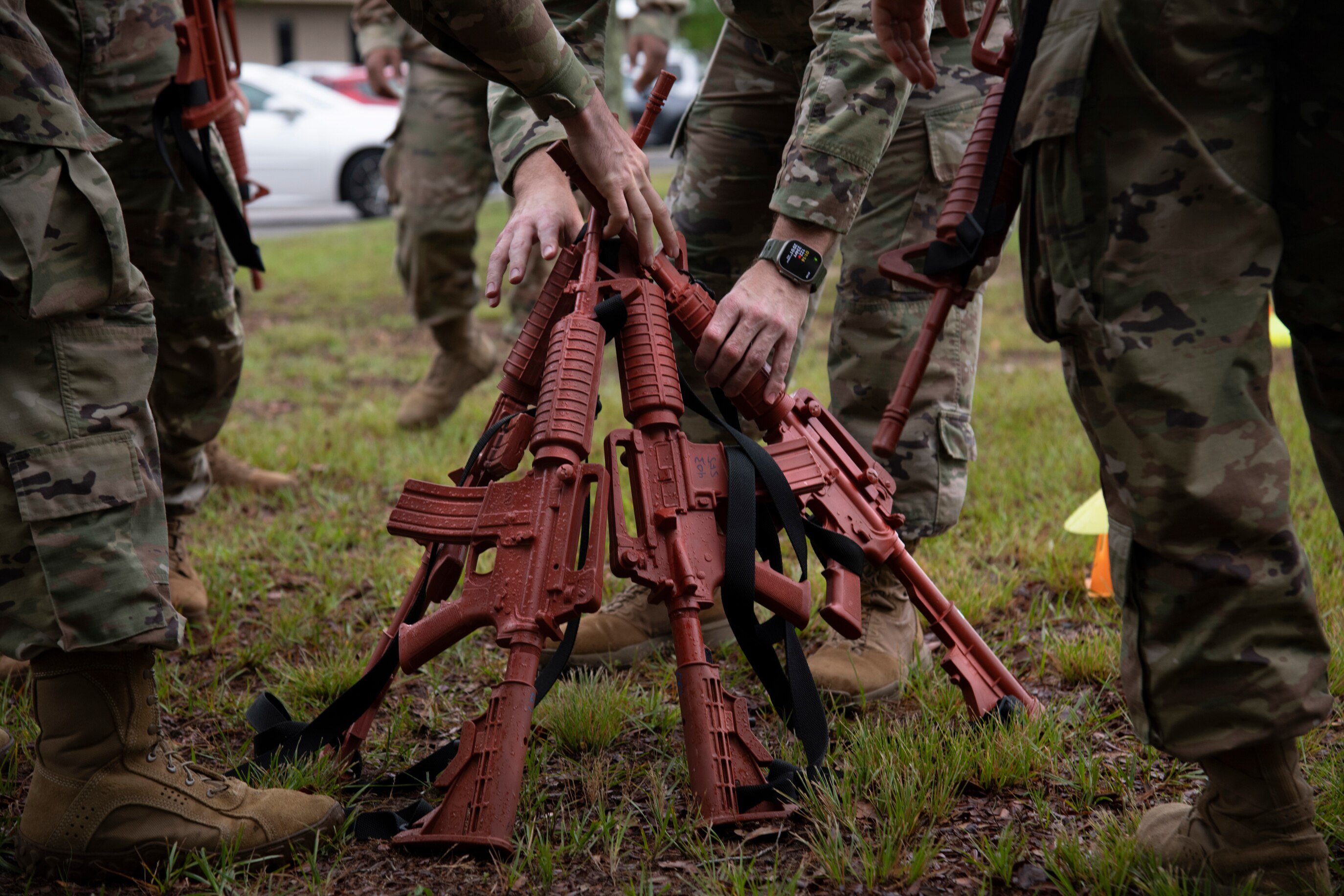 Air Force Reserve Citizen Airmen from the 403rd Security Forces Squadron at Keesler Air Force Base, Mississippi, grab their weapons as part of the Battle Forged Run where units could test participants’ warrior ethos, teamwork, and operational endurance in a high-intensity, mission-oriented environment. (U.S. Air Force photo by Airman 1st Class Shelby Jessee)