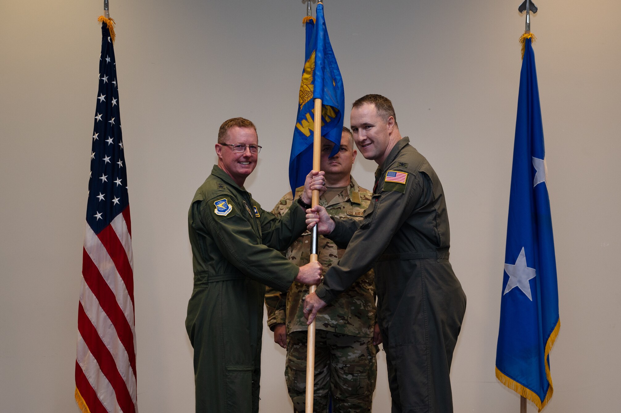 U.S. Air Force Col. Jaret Fish, commander of the 403rd Wing, receives the unit guidon from Maj. Gen. Frank Bradfield III, 22nd Air Force commander, during an assumption of command ceremony at Keesler Air Force Base, Miss., Aug. 3, 2025. The ceremony marked the formal transfer of authority and responsibility to Fish as commander of the 403rd Wing. (U.S. Air Force photo by Senior Airman Shelby Jessee)