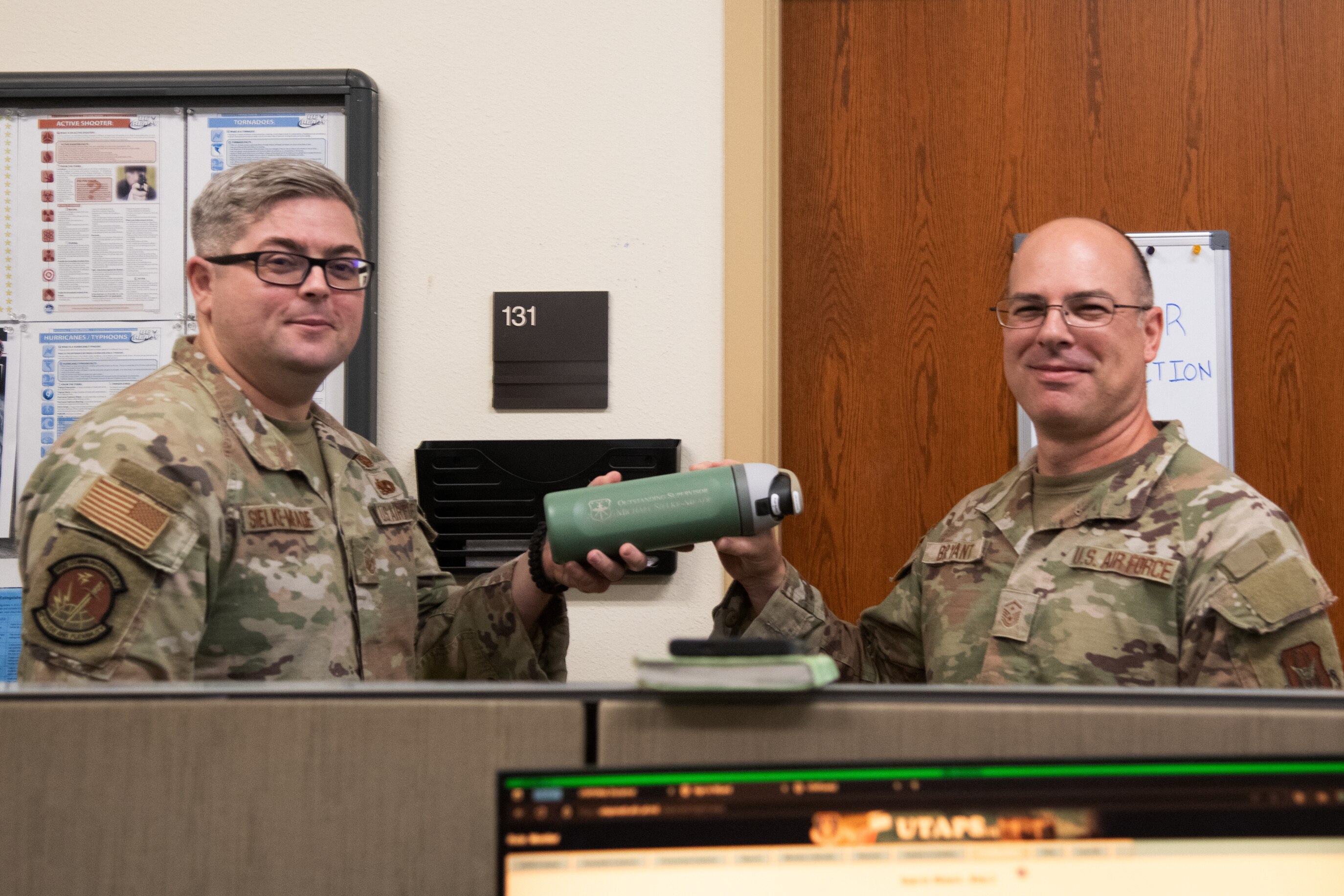 U.S. Air Force Master Sgt. Jared Bryant, 403rd Wing resiliency integrator, presents Master Sgt. Michael Sielke-Meade, 403rd Communications Flight superintendent with an award on Keesler Air Force Base, Miss., Aug. 2, 2025. Sielke-Meade was nominated by one of his Communications Flight Airmen. (U.S. Air Force photo by Senior Airman Shelby Jessee)