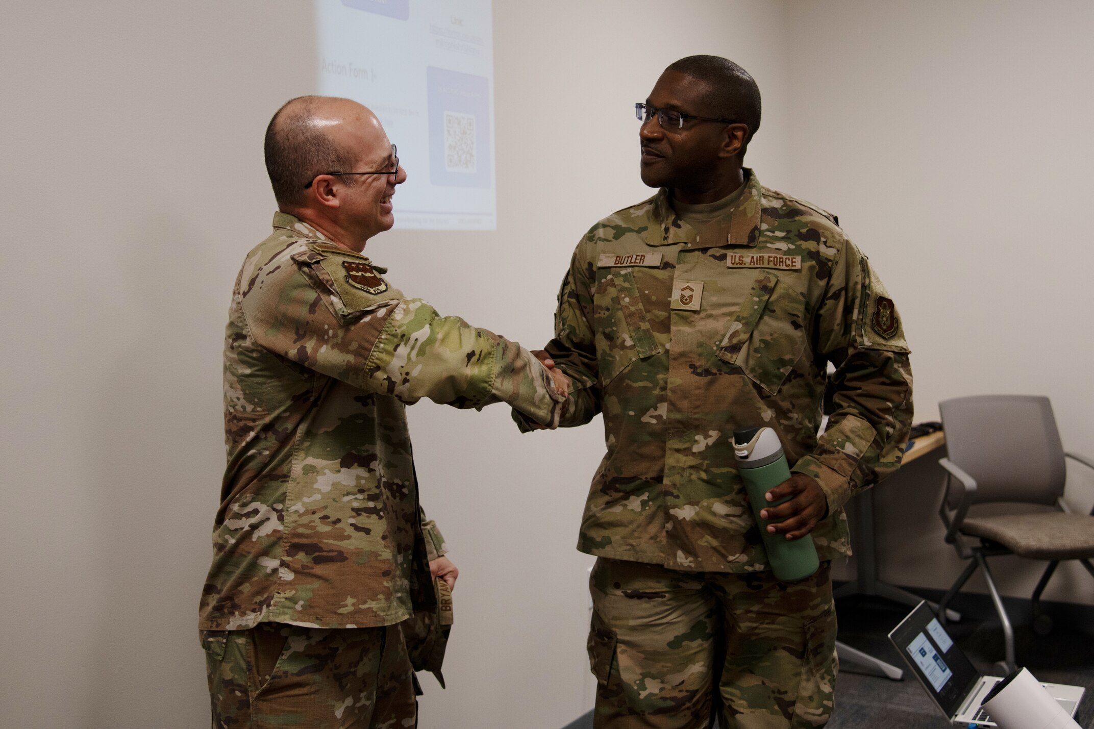 U.S. Air Force Master Sgt. Jared Bryant, 403rd Wing resiliency integrator, gives the Outstanding Supervisor Award to a stand in for Capt. Brent DuPree, 36th Aeromedical Evacuation Squadron flight commander, on Keesler Air Force Base, Miss., Aug. 2, 2025. DuPree was not there to recieve his award but was nominated by one of his Airmen for his mentorship. (U.S. Air Force photo by Senior Airman Shelby Jessee)